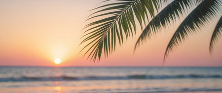 Tropical beach sunset with palm trees, serene horizon. Relaxation and travel concept