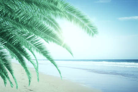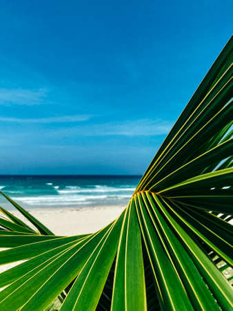 Travel concept. Green palm leaf close up on a tropical island. The sea is in the background. Clear blue sky and white sand on the background. Copy space