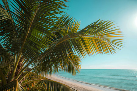 Palm tree branch swaying over a turquoise ocean, tropical beach setting generative ai