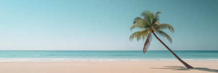 Single palm tree leaning over a beautiful white sand beach with calm turquoise ocean and clear blue sky creating relaxing summer holiday vibes