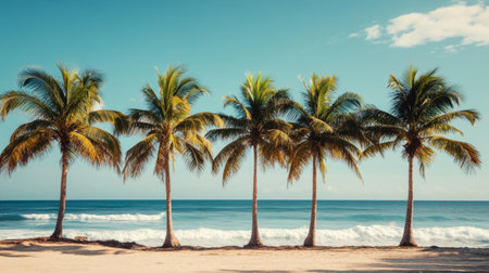 A row of palm trees along a sandy beach, with waves gently crashing in the background.