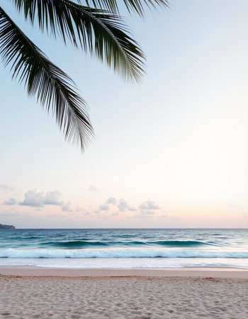 Tranquil beach scene at sunset with soft waves, sandy shore, and palm leaves framing the view, evoking a calm atmosphere.
