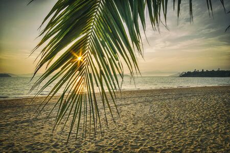 Sunrise with coconut palm leaves on tropical beach background, happy summer holiday concept