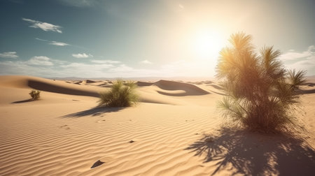 An unspoiled scene featuring a solitary palm tree rising from golden sand dunes under a radiant blue sky. This tranquil landscape embodies serenity and natural beauty, perfect for relaxation themes.