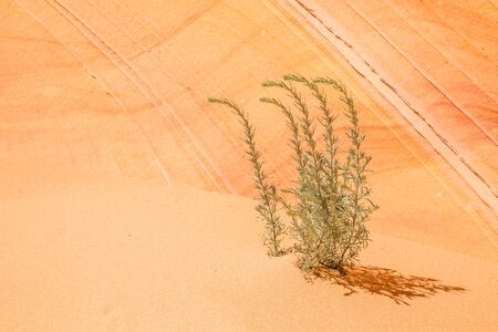 Orange and pink layers in sandstone rock create a backdrop behind five stalks of green sagebrush bent at the top by the wind. Brush growing in sand of the hot Arizona desert.