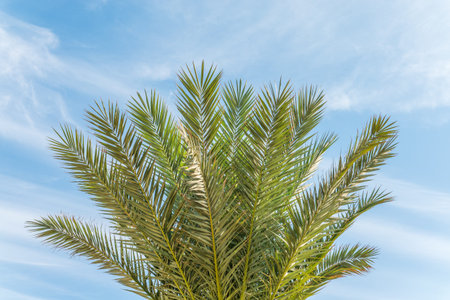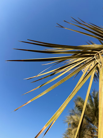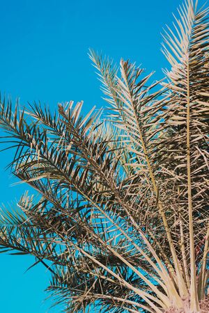 Beautiful palm tree leaves on blue sky background on the South at summer season.