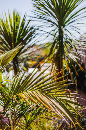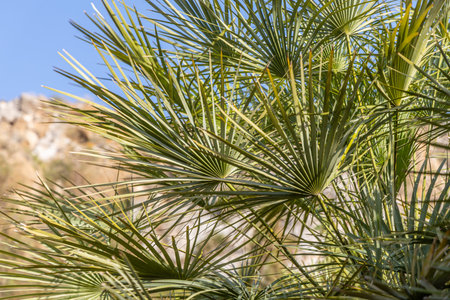 Closeup view of European fan palm tree. Cold-hardy palm, Chamaerops humilis. Selective focus. Tropical green background with copy space