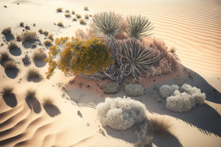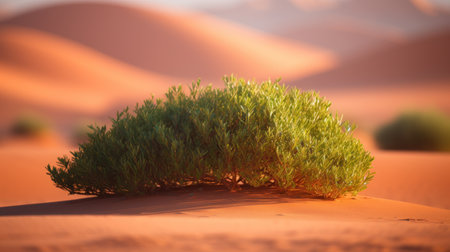 A small plant grows in the middle of an endless desert, with undulating sand dunes stretching to the horizon. the scene is captured from a low angle using a canon eos camera and natural light. it creates a serene atmosphere, showcasing nature's resilience amidst harsh conditions.
