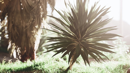 In a warm garden, bright sunlight shines on a striking plant with long, spiky leaves. The surrounding greenery creates a peaceful atmosphere, highlighting natures beauty.