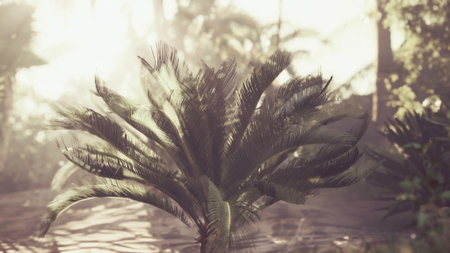 Sunlight filters through the vibrant leaves of ferns in a tropical forest. The gentle breeze makes the lush greenery dance, creating a serene and peaceful atmosphere.