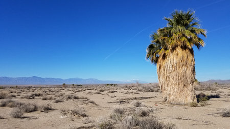 Lone Palm Tree Standing Tall in Vast Desert Landscape Under Clear Blue Sky and Sandy Terrain