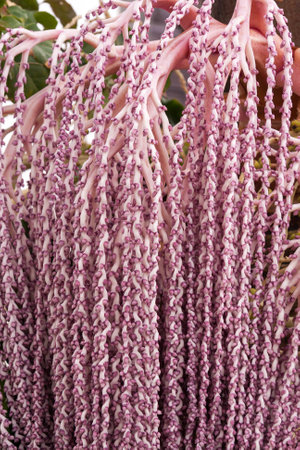 Flower Raja Lipstick Palm (Sealing wax , Lipstick , Raja , Maharajah ) ornamental plant in garden with light sunrise tone. select focus shallow depth of field.