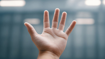 A single human hand, palm open and facing the viewer, raised against a plain background.