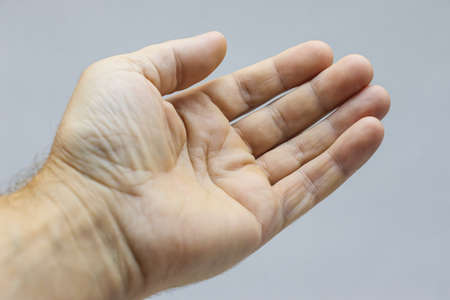 A close-up shot of a man's open hand with the palm facing upwards, set against a soft, vignetted background. The gesture can symbolize asking, receiving, giving, charity, or openness. The lighting is focused on the palm, highlighting the lines and skin texture.