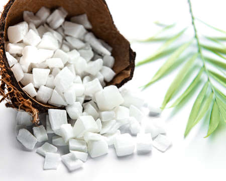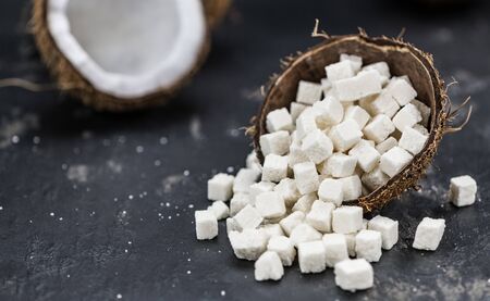 Portion of healthy Coconut dices (selective focus; close-up shot)