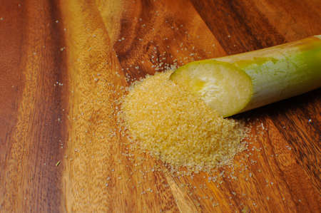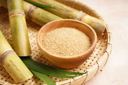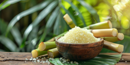 Refined sugar in a glass cup, with fresh sugar cane stems separate, on the old wooden floor, next to pandan tree in green against a brown background