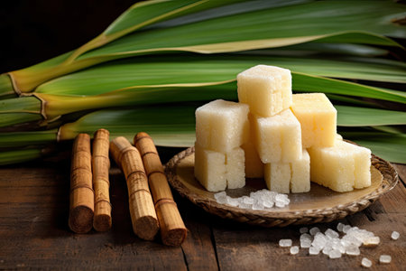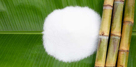 Sugar cane with sugar on banana leaf