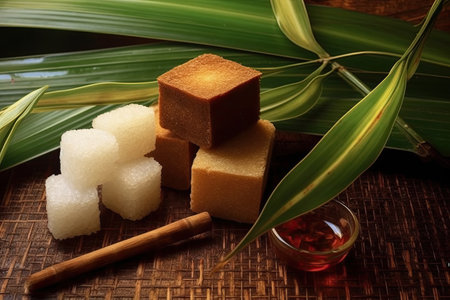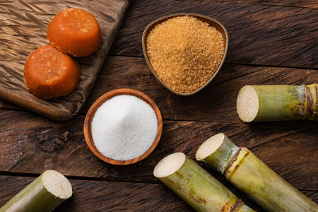 Saccharum officinarum - Panela, brown and white sugar with the stems of sugar cane
