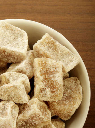 Bowl wood and and white and Brown sand sugar and lump sugar on dark background
