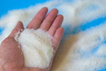 Sugar on hand background, white sugar for food and sweets dessert candy heap of sweet sugar crystalline granulated