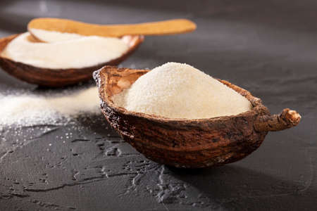 Organic brown palm sugar or coconut sugar made from coconut juice on gray concrete background with copyspace.