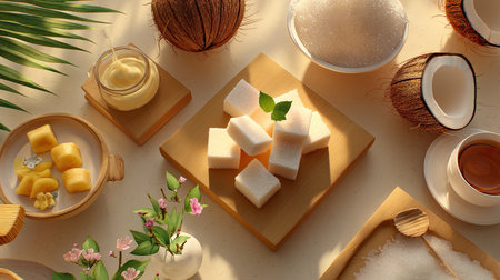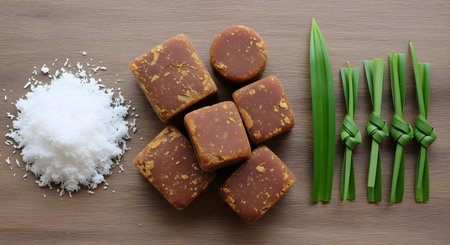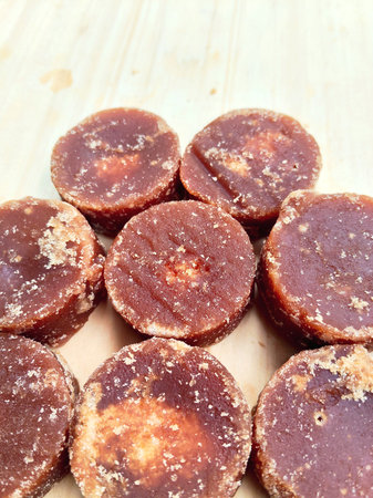 Natural Palm Sugar Discs on a Rustic Wood Board