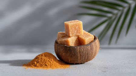Organic brown palm sugar or coconut sugar made from coconut juice in coconut bowl with palm leaf on gray concrete background copyspace. Minimalism.