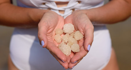 A close-up of a womans hands holding natural salt crystals on the background of a beach. Female hands with sea salt for spa from Dead Sea. Banner.