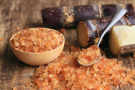 Brown coconut sugar over wooden background