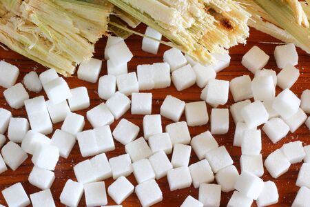 Many white sugar cubes and sugar cane