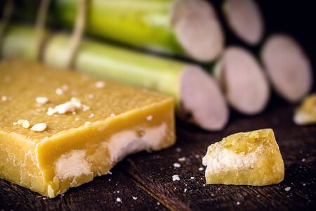 Rapadura is a sugar cane-based sweet, of African origin and consumed in Latin America, in countries like Colombia, Venezuela, Mexico, Ecuador and Guatemala. Pieces of sugar cane in the background