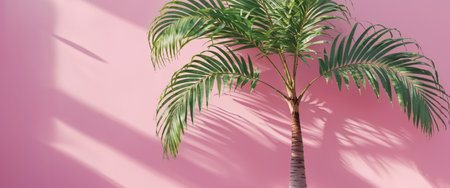 AI Generated. Leafy green palm tree casts a shadow on a pink wall