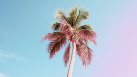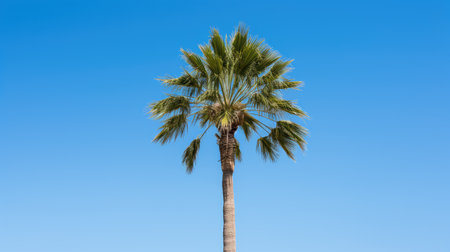 A tall palm trees fronds extend elegantly towards a vibrant blue sky, embodying tropical beauty and relaxation