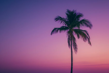 Vacation Background of One Tropical Palm Tree Silhouetted Against Blue Sky at Dusk