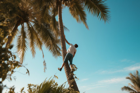 Serenity Amidst Struggle: A Lonesome Figure Ascends the Palm Tree on a Sun-Kissed Seashore