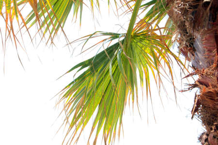Horizontal background with tropical palm tree. Leaves of a tall palm tree and white sky