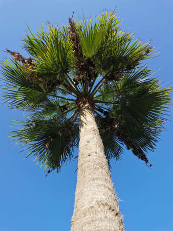 Protaras. Famagusta area. Cyprus. Bottom view of a palm tree with small black fruits against a blue cloudless sky. with beautiful clouds.