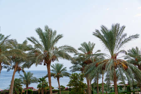 Tops of date palms with fruits against a light sky. Horizontal photo