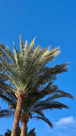 Low-angle view of lush green palm trees set against a vibrant blue sky. Tall palms swaying gently in the tropical breeze, creating a serene and picturesque scene.