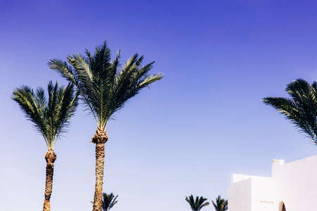 Palm trees against blue sky, Palm trees at tropical coast, vintage toned and stylized, coconut tree, summer tree, vacation travel concept