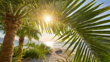 A mesmerizing photo capturing sunlight streaming through lush green palm tree leaves, evoking tropical beach vibes, summers tranquil ambiance, and the picturesque beauty of nature in coastal