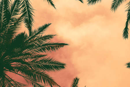 Date palm trees against sunset sky. Beautiful nature background for posters, cards, blogs and web design. Toned effect.