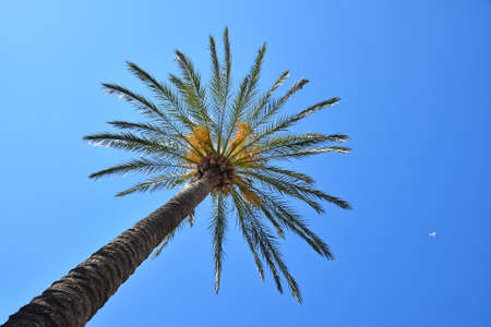 Desert palm against the blue sky, summer, beach vacation. United Arab Emirates. Space for your text.