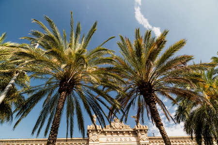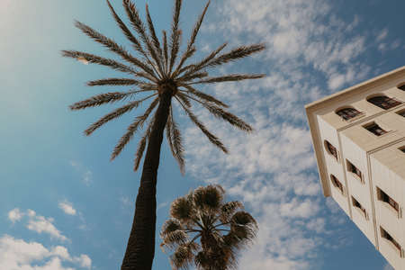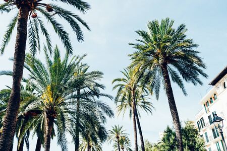 Palm trees along the coast in Palma de Mallorca at beautiful sunny day. Image of tropical vacation and sunny happiness. Filtered vintage photo.