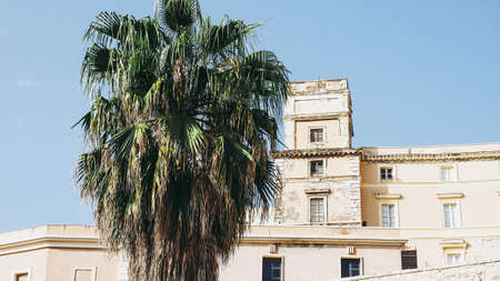 Low angle scenic view on green palm trees with clear blue sky in the city of Rome, Lazio, Italy, Europe. No clouds. Vacation in paradise. Concept traveling holiday.