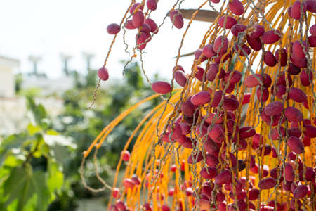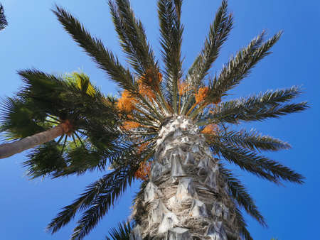 Protaras. Famagusta area. Cyprus. Bottom view of a date palm tree with ripe orange dates against a blue sky.