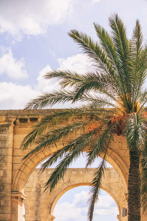 Valletta, Malta, Upper Barrakka Gardens. Stone arches and a palm tree, cloudy blue sky background