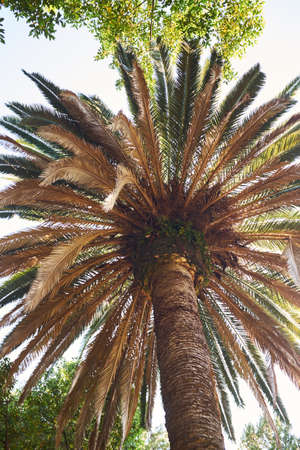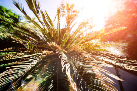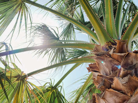 Sun rays making their way through the branches of a palm tree. The concept of recreation and tourism. Travel photography.