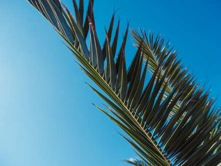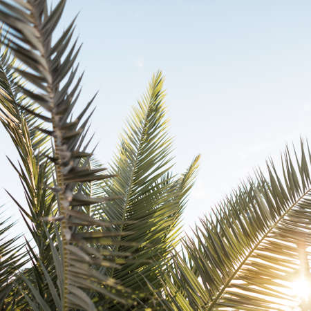 Isolated palm leaves in blue sky, space for text. Summer green palm branches in sun, sway by warm breeze. Exotic travel, tropical journey, paradise vacation, beach resort, hot tour, products placement