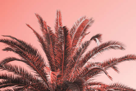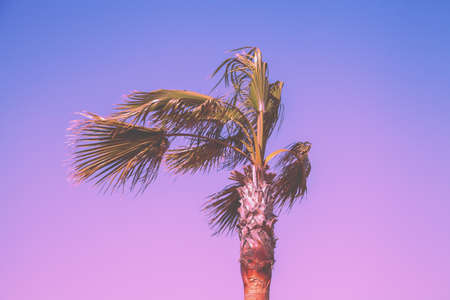 Palm tree top against a gradient sunset sky. Tropical nature background